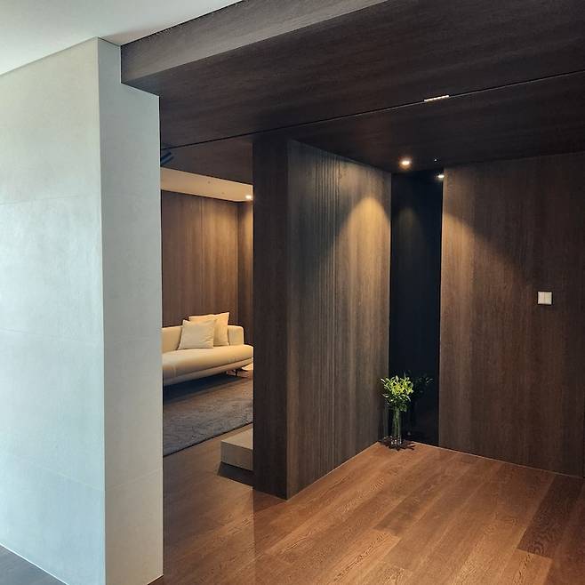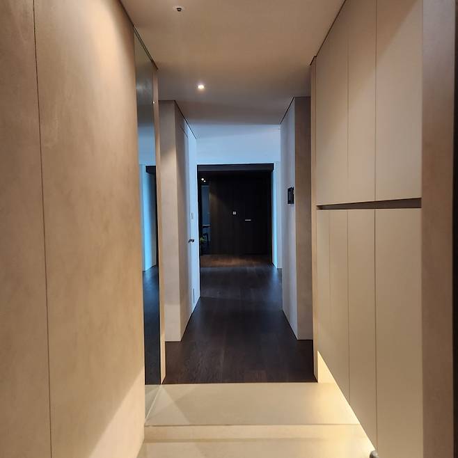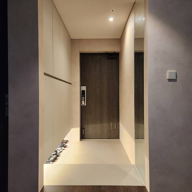 반대편에서 현관을 바라본 모습이에요. 현관문은 우드 필름을 사용하여 자칫 가벼워 보일 수 있는 무드에 무게감을 줬어요. 그리고 좁은 현관의 단점을 보완하기 위해 벽 한쪽에 천장까지 이어지는 거울을 설치하여 넓어 보이는 효과를 줬답니다.