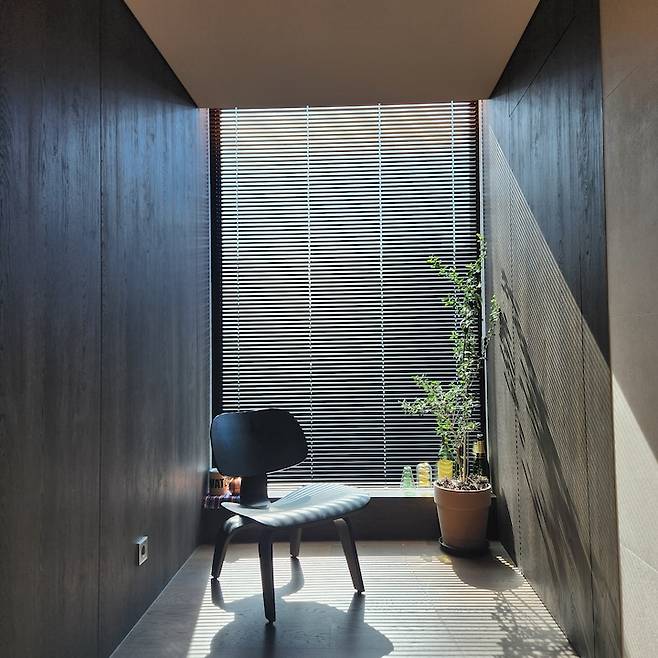 다이닝룸 안쪽, 기존 주방 발코니의 일부를 확장하여 만든 저희 집의 '치유의 공간'이에요. 오후 시간, 블라인드를 내리고 있으면 블라인드 사이로 들어오는 빛의 그림자가 하나의 예술작품같이 느껴져요.