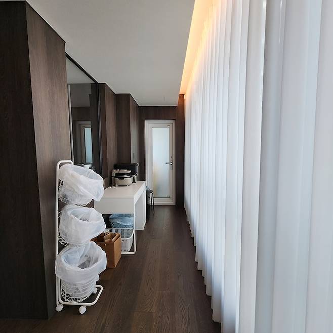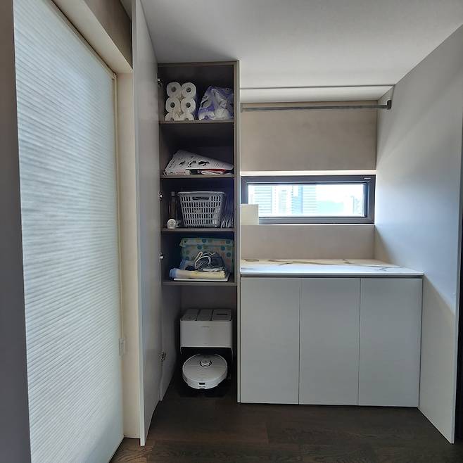 왼쪽에 보이는 곳은 발코니인데 터닝도어를 가리기 위해 허니콤을 설치했어요. 문틀 안쪽으로 쏙 넣어서 다이닝룸에 앉아서 보면 액자 같아 보이고 따뜻한 느낌이 나서 좋아요. 세탁실에도 수납을 넣을 수 있을 만큼 짜넣었고 로봇청소기가 자동으로 나올 수 있게 미리 계획해 뒀어요.