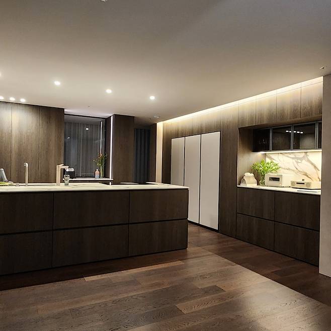 아일랜드 측면에는 홈바를 만들고 그 옆에는 냉장고를 짜 넣었어요. 홈바 상부에 2단으로 장을 짜 넣었는데 하부장은 브라운 컬러의 유리 소재를 사용하면서 상부장보다 안쪽으로 밀어 넣어 답답하지 않으며 포인트가 되어 맘에 들어요.