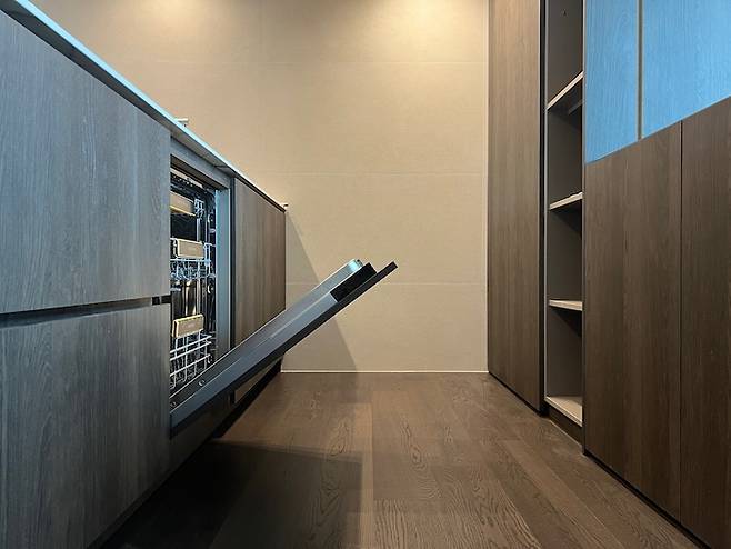 아일랜드 안쪽 모습이에요. 서랍 우측이 식기세척기인데요, 가구 패널을 사용하여 문을 닫으면 아일랜드장의 일부분 같아 보여요.