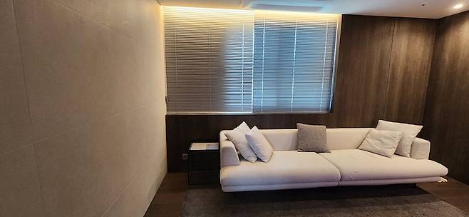 저희는 러그를 좋아해요. 집안의 분위기를 바꿔주거나 포인트를 주기에 러그만한 것이 없는 것 같아요. 기존 집에서부터 쓰던 쎄덱 러그가 미디어룸에 잘 어울리는 것 같아요. 의도치 않았지만 블라인드 컬러와도 같네요.