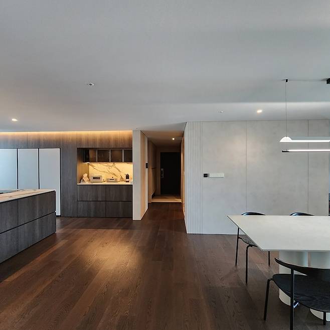 기존 드레스룸을 철거하고 안방 문과 안방 화장실 문의 위치를 변경하여 현관에서부터 이어지는 복도를 더욱 길게 만들었어요. 알박기형 주방이었던 레이아웃을 거실과 주방의 치환을 통해 요리가 즐거워지는 대면형 주방으로 꾸몄죠.
