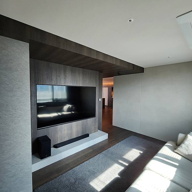 미디어룸에는 소파와 철제 사이드 테이블 그리고 75인치 TV만 뒀어요.