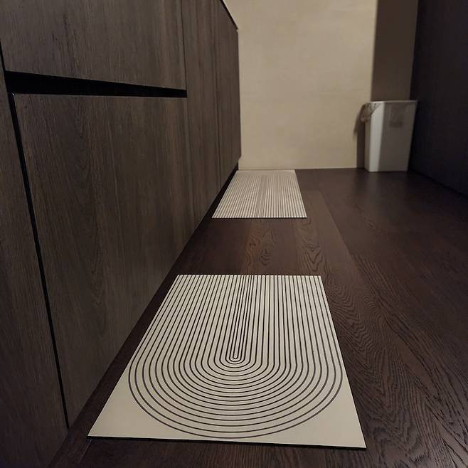 안방에는 밝은 아이보리 러그를 깔아줬는데 그래피티가 연상되는 러그가 자칫 올드해 보일 수 있는 무드를 중화시켜주며 세련된 분위기를 느끼게 해주는 것 같아요.