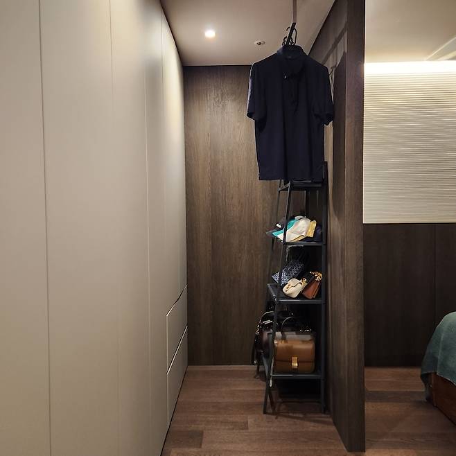 가벽을 설치함으로써 공간을 분리시키고 가벽 뒷면에 이케아 선반을 두어 자주 쓰는 가방과 모자, 한쪽에는 입었던 옷을 정리해뒀어요. 또 천장에는 행거를 설치해 신랑 출근복을 걸어두어 편리성을 높였어요.