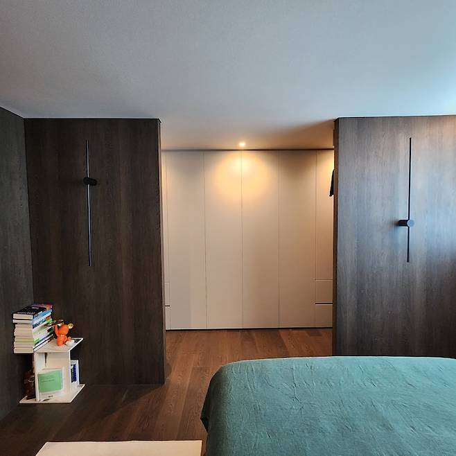 침대에 누웠을 때 보이는 모습이에요. 좌우 대칭으로 이루어진 가벽이 마치 드레스룸으로 들어가는 문처럼 보여요. 가벽에는 벽등을 설치하여 무드를 줬어요.