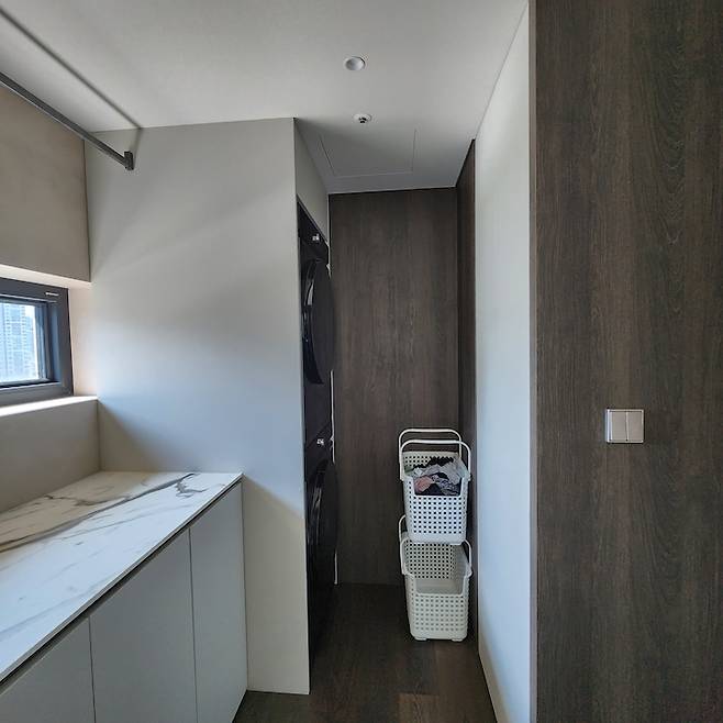 기존 주방 창에서 보이던 뷰가 좋아서 창문은 통창으로 설치했고 건조까지 끝난 빨래를 갤 수 있게 하부장을 짜넣었어요. 상판에서는 다림질도 할 수 있고 장 위에는 다림질할 옷이나 젖은 빨래를 말릴 수 있게 행거를 설치했답니다. 세탁과 관련된 일은 이곳에도 모두 끝낼 수 있게 계획했어요.