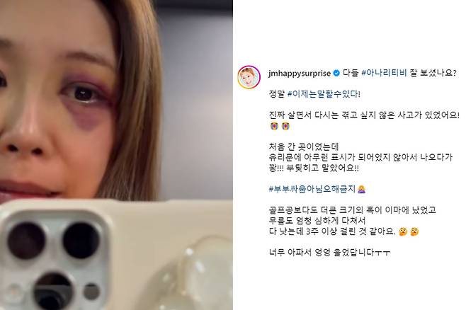 사진 속에서 이정민은 한쪽 눈에 크게 멍이 든 모습으로, 얼굴 부상이 심각해 보인다. 흔치 않은 부상 부위와 강한 멍 자국은 네티즌들의 큰 관심을 끌었다.