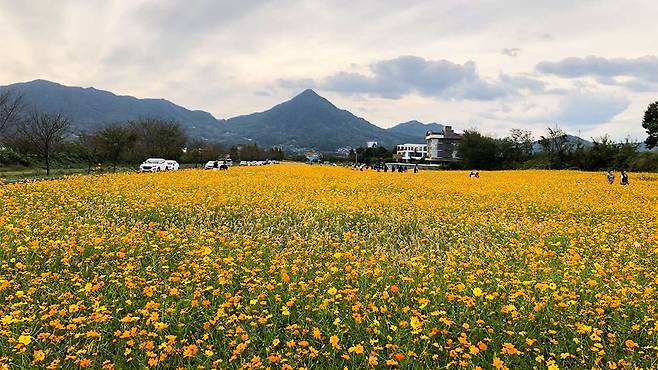 올해 가조온천꽃단지는 분홍빛 토종 코스모스와 황금빛 황화 코스모스를 절반씩 나눠 심어, 한 폭의 수채화 같은 풍경을 완성했다.