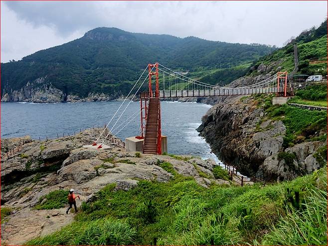 섬을 둘러싼 해안 절벽 길인 욕지 비렁길에는 스릴 넘치는 출렁다리가 세 곳 설치되어 있습니다. 특히 펠리컨 바위 인근 제1 출렁다리는 아찔하게 내려다보이는 바다 풍경이 압권이지요. 파도 소리와 함께 걸을 때마다 출렁이는 다리 위에서 남해의 진면목을 만날 수 있습니다.