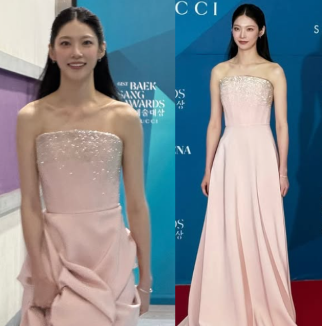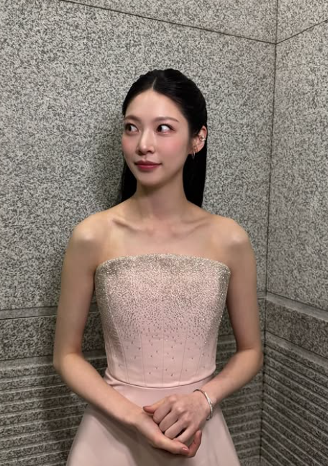 공승연이 착용한 연핑크 컬러의 튜브톱 드레스는 그 자체로 포인트가 되는 아이템이었어요. 상반신을 따라 촘촘히 수놓인 실버 스톤 장식이 눈부신 반짝임을 연출하며, 은은하지만 존재감 있는 디테일로 스타일링을 완성해줬죠.