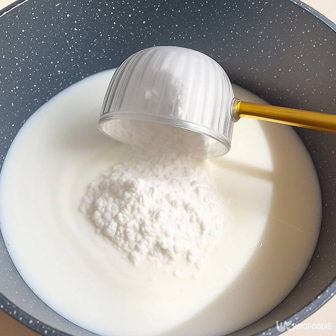 1. 팬에 우유를 붓고 찹쌀가루 20g, 옥수수 전분 40g, 설탕 40g, 소금 ¼작은술을 넣고 섞어준다.