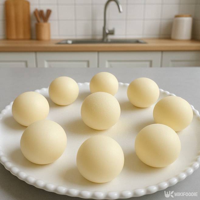 적당히 굳은 반죽은 알뜰주걱이나 칼을 이용해 먹기 좋은 크기로 잘라낸다. 손에 참기름을 약간 묻힌 뒤 반죽을 동그랗게 말아주면 모양이 깔끔하게 완성된다.