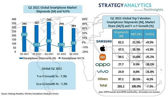 시장조사기관 스트레티지 애널리틱스는 지난 29일(현지시간) 새로운 시장 보고서를 통해 2022년 2분기 전 세계 스마트폰 출하량이 지난해 같은 기간보다 7% 감소한 2억9100만대로 집계됐다고 전했다.