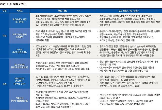 국내 금융권과 기업 입장에서는 탄소배출권 시장, 지속가능성 공시, K-GX 정책 방향이라는 국내 변수 위에 CBAM·에코디자인·기후금융이라는 외부 변수가 겹쳐지는 만큼 2026년을 단순한 ‘규제의 해’가 아니라 '자본과 기술, 산업 구조를 재편하는 ESG 실전의 원년'으로 받아들이고 선제적인 대응 전략을 마련해야 한다는 지적이 설득력을 얻고 있다. 결국 내년도 ESG 의제는 규제 대응과 비용 통제를 넘어 탄소·공시·제품·금융을 아우르는 통합 전략을 얼마나 빠르게 구축하느냐가 최대 핵심 쟁점이 될 전망이다.