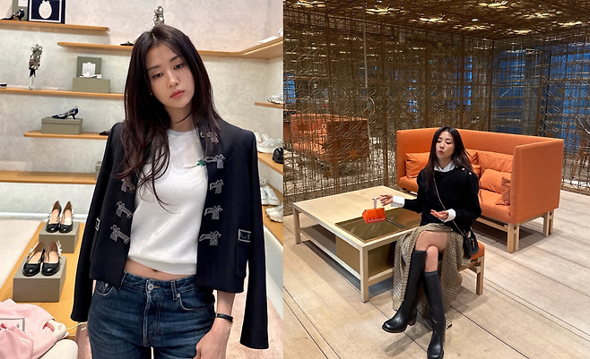 세 번째 룩에서는 도회적이고 시크한 매력이 물씬 풍긴다. 독특한 매듭 장식이 돋보이는 블랙 컬러의 크롭 기장 밀리터리 재킷을 어깨에 걸쳐 스타일리시한 면모를 과시했다. 이너로는 심플한 화이트 티셔츠를 착용해 재킷의 화려한 디테일을 더욱 부각시켰으며, 살짝 드러난 허리 라인이 쿨한 분위기를 자아낸다. 하의는 딥한 컬러의 데님 진을 매치해 편안하면서도 멋스러운 캐주얼 룩을 완성했는데, 무심한 듯 시크한 표정과 어우러져 세련된 아우라를 완성했다.