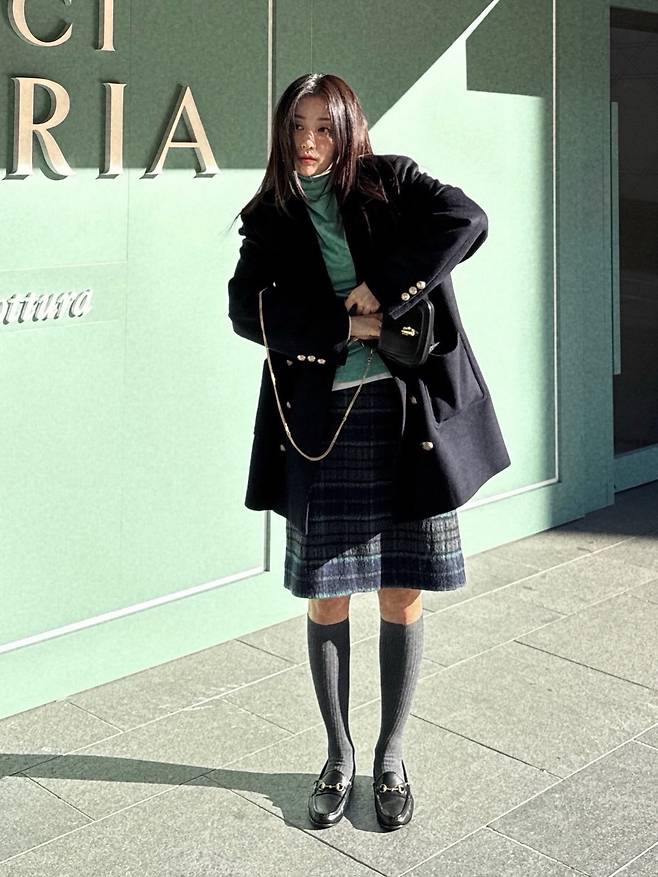 첫 번째 룩에서는 단정하면서도 소녀스러운 감성이 돋보인다. 금장 버튼이 포인트가 되는 짙은 네이비 컬러의 피코트를 착용하여 클래식한 무드를 연출했다. 이너로는 산뜻한 민트 컬러의 터틀넥을 선택해 자칫 무거워질 수 있는 겨울 코디에 화사함을 더했으며, 체크 패턴의 스커트를 매치해 프레피 룩의 정석을 보여준다. 여기에 무릎까지 오는 그레이 니 삭스와 골드 장식의 블랙 로퍼를 신어 전체적인 룩의 밸런스를 맞추고, 체인 스트랩이 달린 미니 백을 들어 귀여운 포인트를 살렸다.