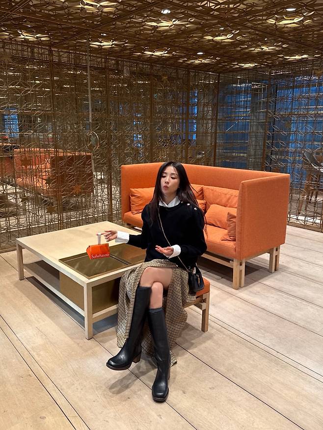 마지막 사진에서는 우아하면서도 성숙한 여성미가 느껴진다. 화이트 셔츠와 블랙 니트를 레이어드하여 깔끔한 상의 스타일링을 연출했고, 하의로는 체크 패턴의 롱 스커트를 선택해 고급스러운 분위기를 더했다. 특히 스커트의 깊은 슬릿 사이로 보이는 블랙 레더 롱부츠는 각선미를 은근하게 드러내며 페미닌한 매력을 강조한다. 전체적으로 차분한 컬러감이지만 소재와 패턴의 조화를 통해 지루하지 않고 감각적인 가을, 겨울 패션을 완성했다.