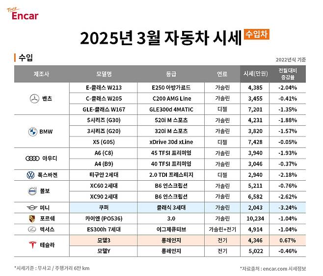 수입차도 연초 대비 시세 하락폭이 감소해 전월 대비 평균 1.27% 하락했다. 그 중 일부 SUV 시세 하락이 타 차종 보다 두드러졌다. 미니 쿠퍼 클래식 3세대는 3.24%, 볼보 XC90 2세대 B6 인스크립션은 2.62%, 폭스바겐 티구안 2세대 2.0 TDI 프레스티지는 2.18% 하락했다. 반면, BMW X5 (G05) xDrive 30d xLine은 0.05% 하락으로 시세 변화가 크지 않았다. 독일 인기 세단인 벤츠 E-클래스 W213 E250 아방가르드는 2.04%, BMW 5시리즈 (G30) 520i M 스포츠는 1.88%, 아우디 A6 (C8) 45 TFSI 프리미엄은 1.93% 시세가 하락했다. 전기차의 경우 시세 변동폭이 내연기관차 대비 크지 않았다. 현대 아이오닉5 롱레인지 프레스티지와 테슬라 모델3 롱레인지는 각각 0.49%, 0.67% 상승했고, 모델Y 롱레인지는 0.46% 하락했다.