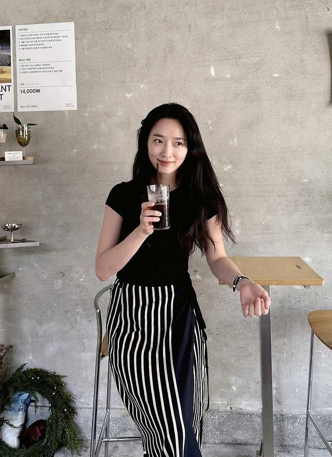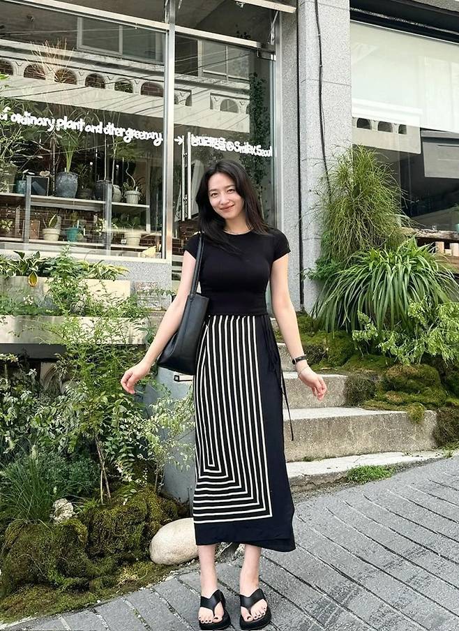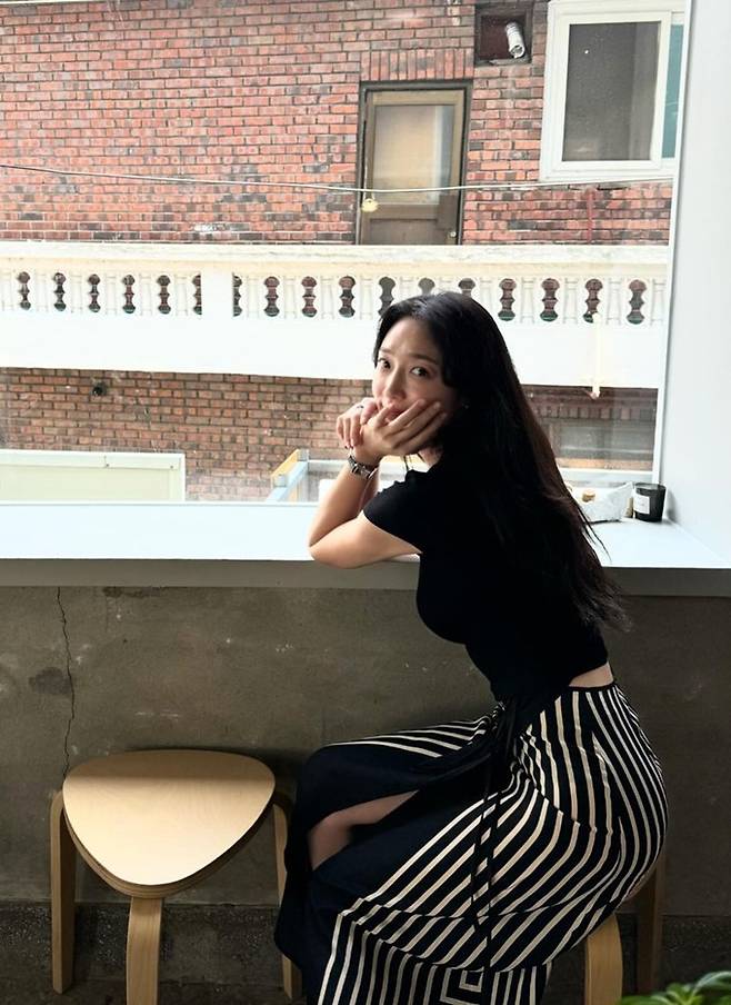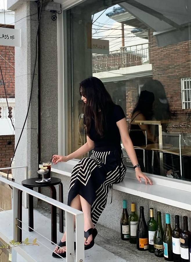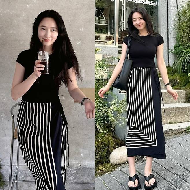 공개한 사진에서 표예진은 가녀린 몸매에 화이트 라인이 디자인된 스트라이프 슬릿 블랙 스커트와 블랙 티셔츠를 착용한 외출 데일리룩으로 슬림한 옷 태를 완성했다.