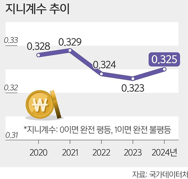 김현기 국가데이터처 복지통계과장은 “1분위의 소득증가율이 5분위의 증가율보다 낮다”며 “소득격차가 벌어진 점이 전체적인 소득분배지표 악화에 영향을 끼쳤다”고 분석했다.