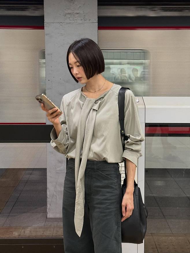 블랙 숄더백은 실용적인 포인트로 더해져 출퇴근길 혹은 일상적인 외출에서도 손색없는 무드를 완성한다. 여기에 단정한 단발 헤어와 미니멀한 목걸이는 불필요한 장식을 덜어내고 간결한 매력을 극대화했다. 지하철 플랫폼이나 계단 위에서도 자연스럽게 어울리는 룩은 그녀의 도시적 감각을 더욱 강조한다.