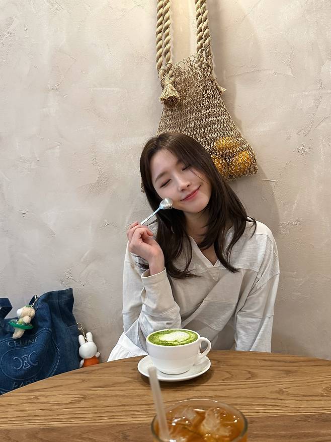 카페 한켠에서 말차라떼를 마시며 미소 짓는 컷은