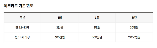 사용 한도: KB국민카드의 만 12~13세 고객은 1회/1일 3만원, 월간 30만원 한도 안에서 쓸 수 있어요. 만 14세 이상은 카드를 발급받을 때 1회/1일 600만원, 월간 2,000만원 한도로 설정되고요.