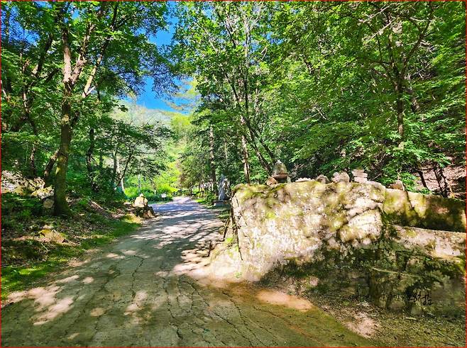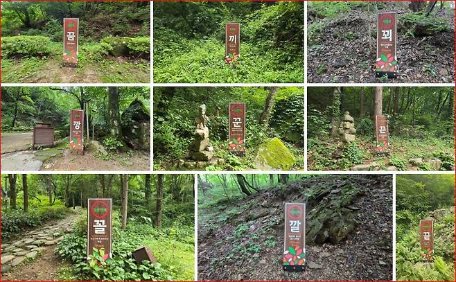구곡폭포는 매표소에서 약 20분 정도 걸어가면 도착할 수 있을 만큼 접근성이 좋습니다. 경사가 완만하고 산책로 주변으로 숲과 계곡이 이어져 있어 남녀노소 누구나 걷기에 부담이 없습니다. 길을 따라 걷다 보면 ‘꿈, 끼, 꾀, 깡’처럼 쌍기역(ㄲ)으로 표현된 아홉 가지 덕목인 ‘구곡혼(九曲魂)’을 담은 나무판이 곳곳에 세워져 있어, 마치 숲 속 작은 퀘스트처럼 재미를 더해 줍니다.