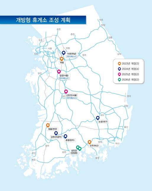 올해 개방형 휴게소로 문을 여는 곳은 지자체와 협의를 마친 진주·정읍(호남고속도로)·덕평휴게소(영동고속도로) 등 3곳이다. 개장 시기는 정읍휴게소 8월 8일, 진주휴게소 10월, 덕평휴게소 12월로 정해졌다. 이천(중부고속도로)·논공과 강천산(광주대구고속도로)·춘향휴게소(순천완주고속도로)는 2024년, 신탄진과 입장휴게소(경부고속도로)는 2025년, 섬진강휴게소(남해고속도로) 양방향 2곳은 2026년에 운영을 시작한다. 특히 입장·이천·신탄진휴게소에는 하이패스 나들목(IC)이 설치되기 때문에 직접 고속도로로 진출 및 출입도 할 수 있다.
