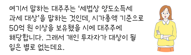 하지만 2023년까지는 시가총액 기준이 10억 원이었기 때문에 대주주에 해당하는 경우가 적지 않았습니다.