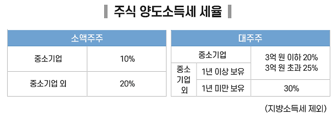 대주주의 경우 양도소득이 3억 원 이하라면 20%, 3억 원을 초과했다면 25%의 세율을 적용하고, 중소기업이 아닌 기업의 주식을 1년 미만 보유 시에는 30%의 세율을 적용합니다.