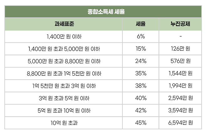 종합소득세율은 아래와 같이 최소 6%에서 최대 45%(지방소득세 제외)의 초과누진세율이므로 종합소득이 많을수록 세 부담이 커지는 구조입니다.