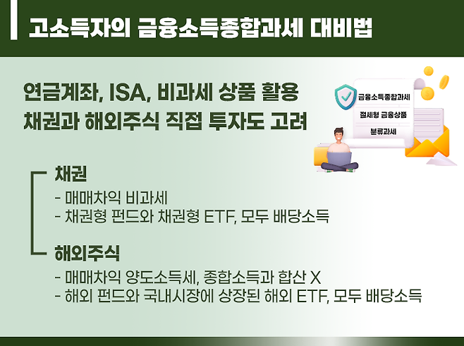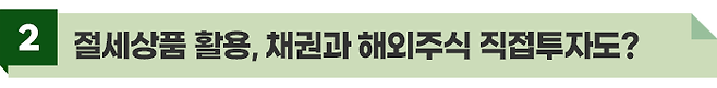 이 외에도 금융소득으로 과세되는 투자보다는 매매차익이 비과세되는 채권이나 분류과세 되는 해외주식에 직접 투자를 하는 것도 좋은 방법 중의 하나가 될 수 있는데요.