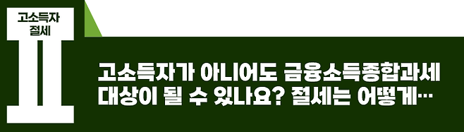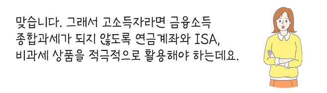 이렇게 다른 소득까지 합산하게 되어 종합소득세율이 적용되므로 세 부담은 더 커질 수밖에 없습니다. 그래서 금융상품에 투자해서 이자·배당소득이 발생했을 때는 금융소득종합과세 대상자가 되지 않도록 조심해야 합니다.