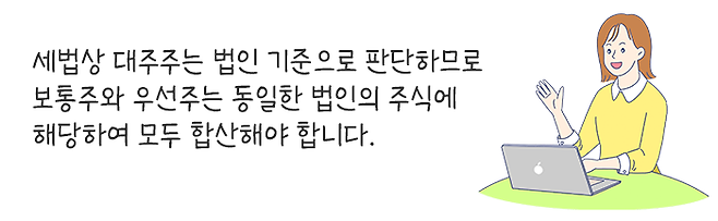 예를 들어 코스피 종목에 해당하는 A주식의 보통주 1% 또는 우선주 1%를 가지고 있거나 혹은 보통주와 우선주를 모두 합산하여 1%를 가지고 있어도 모두 대주주가 된다는 것입니다. (금액 기준도 동일)