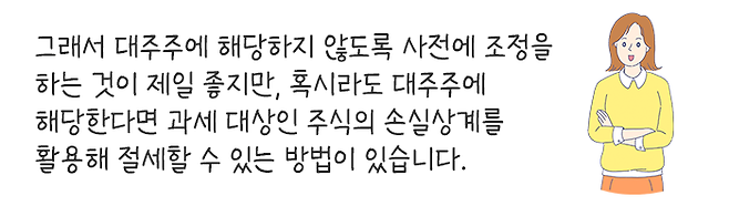 이를 활용하여 만약 국내 상장주식에서 손실이 났다면 장외로 매도하여 손실을 확정 짓거나 해외주식에서 손실이 났다면 매도하여 손실을 실현시킨 후에, 대주주가 된 종목의 매매차익과 상계하여 세 부담을 줄이는 것입니다.