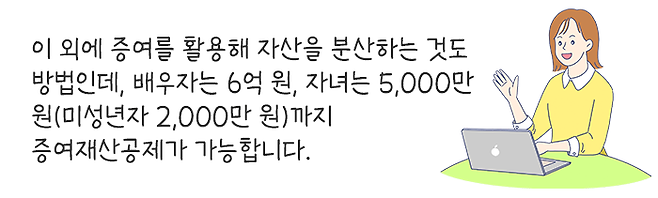 그리고 자녀에게 미리 증여해서 자녀의 재산을 키워주는 것 또한 중요하므로, 증여를 통해 재산을 분산하여 본인의 세 부담도 낮추고 다른 가족의 재산을 증식시키는 일석이조의 효과를 누릴 수 있게 될 것입니다.
