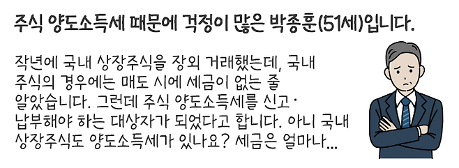 국내주식의 경우장외거래를 하거나 비상장주식에 해당하면 양도소득세 과세 대상이 되고 해외주식은 모두 다 과세 대상이 됩니다.