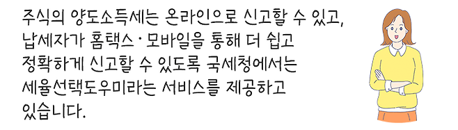세율선택도우미란 중소기업·상장주식·대주주 관련 도움자료를 제공하고, 납세자가 해당 여부를 선택하면 세율이 자동으로 적용되어 복잡한 양도세율을 쉽게 선택할 수 있는 서비스를 말합니다.