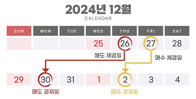 2024년의 경우 12월 31일은 주식 휴장일이었으므로 12월 30일에 주식 매도 결제가 되어야 합니다. 이 때문에 늦어도 26일까지는 매도 주문이 체결되어야 한다는 것입니다.