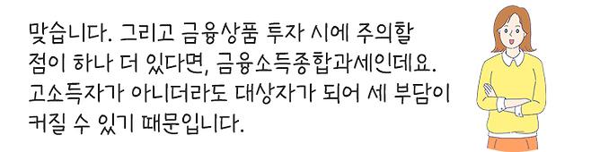 또 금융상품에 투자할 때 주의점은 뭐가 있을까요? 은퇴 후 금융소득으로 생활비를 충당하려고 하는데… 세금이 무섭네요.