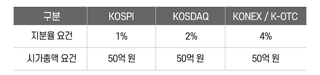 하지만, 지분율 기준은 해당 주식이 상장된 시장에 따라 달라지는데, KOSPI일 경우에는 1%, KOSDAQ은 2%, KONEX/K-OTC는 4%의 지분율을 적용하는데요.