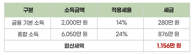 그리고 종합소득 6,200만 원에 대한 세금은 876만 원(적용세율 24%)이므로 합산 세액은 1,156만 원입니다.