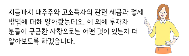 대표적인 세금으로는 보유 시 배당소득에 대한 배당소득세, 매도 시 양도소득(매매차익)에 대한 양도소득세가 과세됩니다.
