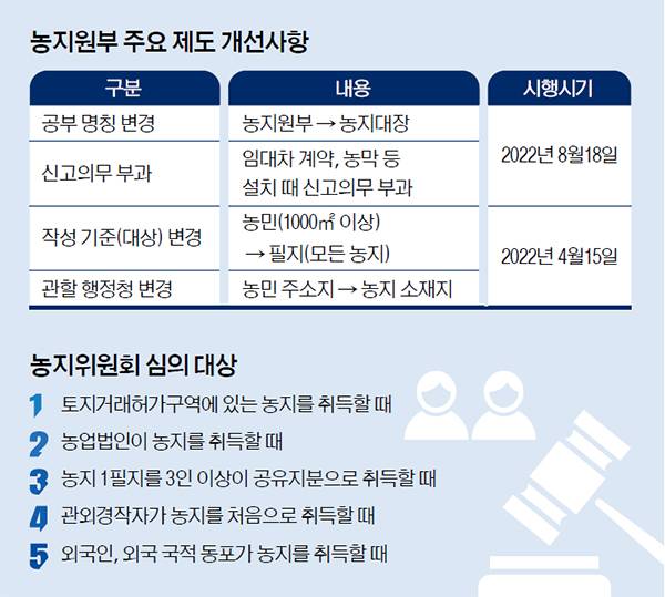 달라진 점은 두가지다. 우선 투기 위험이 높은 지역의 농지를 취득할 때는 농지위원회에서 심의를 받아야 한다는 점이다. 농지위원회는 시·구·읍·면에 설치되는 자문기구로 지역농민·전문가 등 10∼20명으로 구성한다.