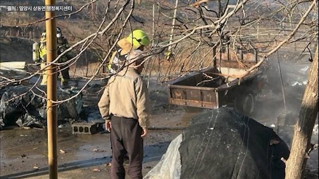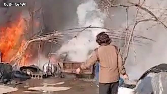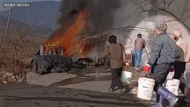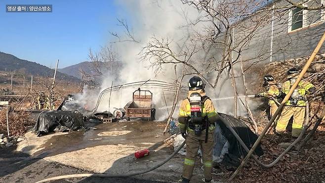 잠시 후 밀양소방서 교동119안전센터 대원들이 현장에 도착했고, 대원들은 20여분 만에 큰불을 잡는 데 성공합니다. 그리고 10여 분 뒤쯤, 작은 불씨까지 완전히 진압합니다.