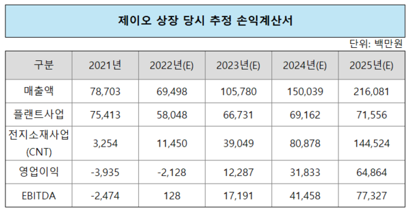기술특례상장 방식으로 코스닥 시장에 입성한 제이오는 2024년과 2025년 매출 추정치로 각각 1500억원, 2161억원을 제시했다. 상장의 핵심축이었고 볼 수 있는 CNT 사업부문의 해외 공급량이 2023년부터 증가할 것이란 가정에서 나온 추정치다.