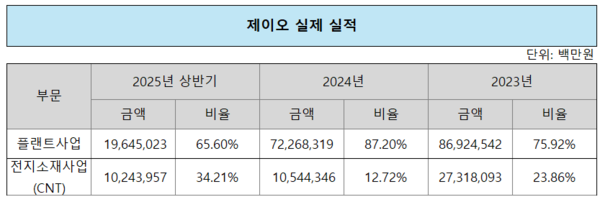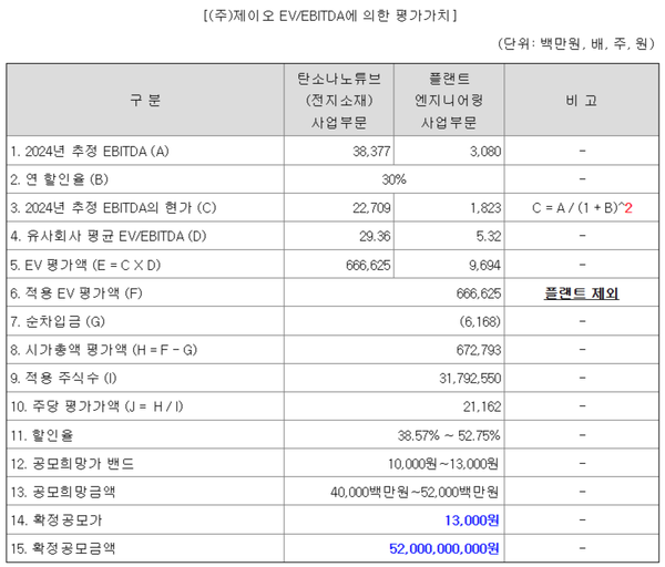 실제 제이오는 기업공개(IPO) 과정에서 CNT를 차세대 전지소재로 강조하며 공격적인 성장 로드맵을 그렸다. 2025년까지 CNT 사업이 중심인 전지소재 사업부에서만 연간 매출 1234억원과 EBITDA(상각전영업이익) 773억원을 달성할 것이라고 제시했다. 대신 설립 때부터 이어왔던 플랜트 엔지니어링 사업부는 밸류에이션 산정에서 완전히 제외됐다.